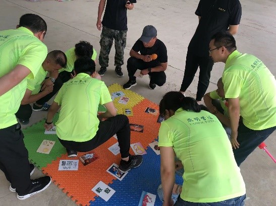 急速60秒:小组成员通过沟通与协作,在最短的时间内按顺序拍完绳圈内1-30的数字信息;培养了团队决策统筹意识,大团队意识,团队间的相互合作;团队处理突发事情能力;在执行过程中对目标偏离时,怎样快速沟通重新调整计划;以及计划、沟通等。七巧板:此项目演绎了一个变化的市场情景,从信息收集,到科学决策,到坚决执行。从上至下考验着一个团队领导者的领导力,团队成员按照每一轮任务的不同,将正确的卡片按顺序翻出,用时最短的团队胜出。处处体现出团队中服从与沟通、团队执行力、团队高效协作、团队信任感建立。